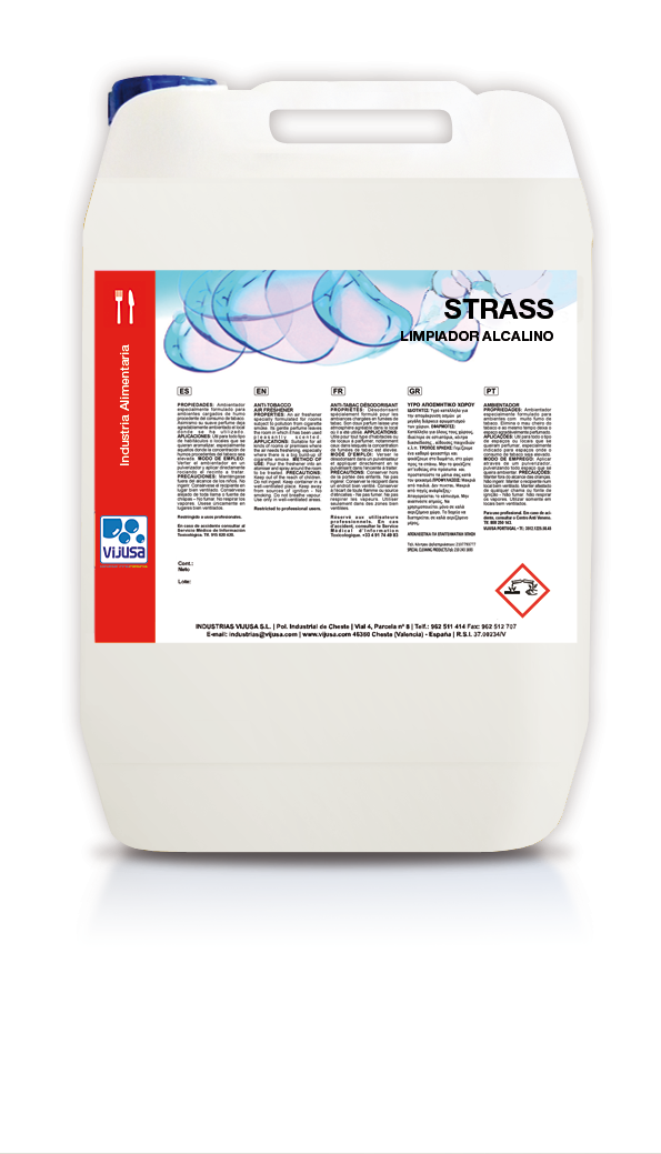 Detergente líquido fuertemente alcalino. Compatible con superficies de acero inoxidable, hierro, vidrio, baldosas y recubrimientos epoxi, resistentes a los álcalis.